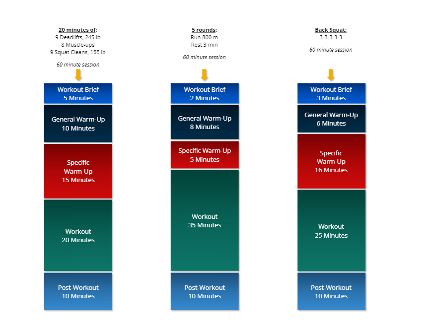 • ช่วงก่อนฝึก: รวมเวลาสำหรับการบรรยายสรุป (workout brief) และการวอร์มอัพ (warm-up)