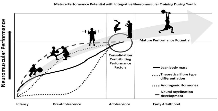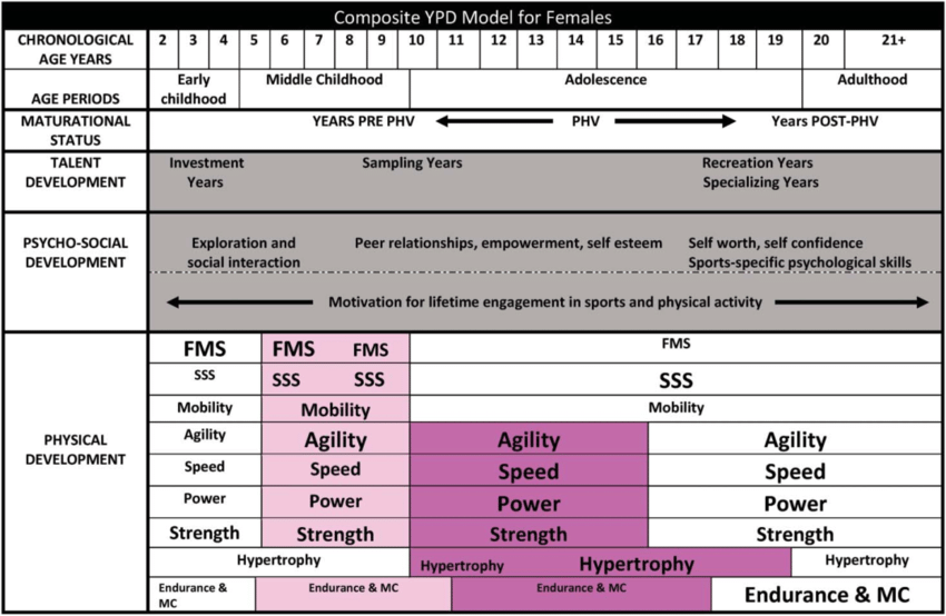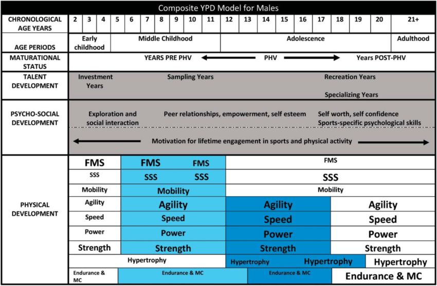 หลังวัยรุ่น: Force-Velocity ซึ่งเป็นกราฟที่ใช้แสดงความสัมพันธ์ระหว่างแรง (Force) และความเร็ว (Velocity) ในการฝึกซ้อมทางด้านความแข็งแรงและพละกำลังของนักกีฬา เพื่อปรับการฝึกที่เน้นความแข็งแรงเฉพาะทาง เช่น ความแข็งแรงสูงสุด เทียบกับความอดทนของกล้ามเนื้อ การเพิ่มขนาดกล้ามเนื้อ เป็นต้น เพิ่มพัฒนาการด้านพลังโดยการฝึกพลังระเบิดผ่านการยกน้ำหนักแบบโอลิมปิก พลัยโอเมตริกที่มีน้ำหนัก และการวิ่งลากรถเลื่อน (Sled Push/ Sled Pull) นอกจากนี้ยังควรแนะนำการพัฒนาระบบพลังงาน (Energy System Development) โดยเน้นระบบพลังงานที่เฉพาะเจาะจงผ่านการฝึกแบบอินเตอร์วัลและเกมขนาดเล็ก พิจารณาตามตำแหน่งการเล่นในกีฬาต่างๆ