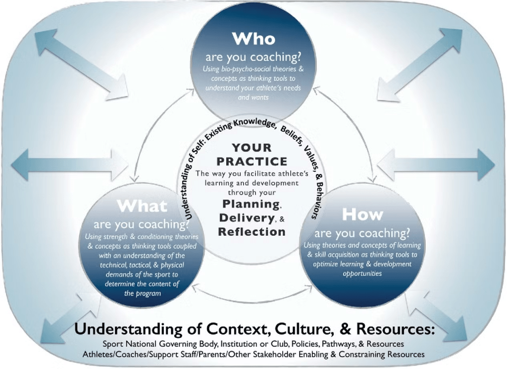 กรอบแนวคิดสำหรับการตัดสินใจในงานโค้ชด้านความแข็งแรงและการปรับสภาพร่างกาย ลูกศรเชื่อมต่อระหว่างโดเมนความรู้แสดงให้เห็นว่าแม้ว่าโดเมนต่างๆ จะถูกนำเสนอเป็นพื้นที่ความรู้เฉพาะ แต่ก็มีการเชื่อมโยงระหว่างแต่ละโดเมน ลูกศรสองทางระหว่าง “ใคร” “อะไร” “อย่างไร” “P-D-R” และ “ตนเอง” กับด้านนอกของรูปแสดงให้เห็นว่าความรู้ในทุกด้านเหล่านี้ถูกกำหนดและได้รับอิทธิพลจาก “บริบท วัฒนธรรม และสภาพแวดล้อม”