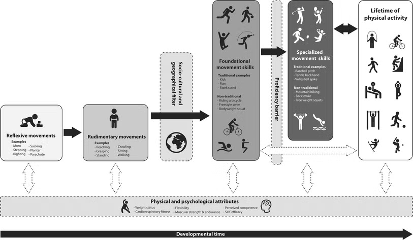 โดยการสร้างทักษะที่ครอบคลุมและปรับตัวได้ จะช่วยส่งเสริมความยั่งยืนในการทำกิจกรรมทางกาย ทักษะที่แข็งแรงตั้งแต่ต้นจะส่งผลต่อการมีส่วนร่วมในการออกกำลังกายเมื่อโตขึ้น