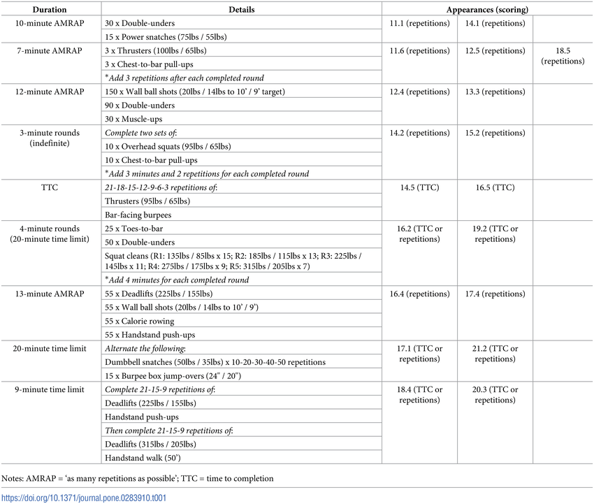 งานวิจัยพบว่าการ เล่น Wokrout เดิมซ้ำทำให้นักกีฬาสามารถพัฒนาได้ดีขึ้น โดยเฉพาะในนักกีฬาหญิงที่มีอัตราการพัฒนาเฉลี่ยที่ 8.3% ต่อปีเมื่อเทียบกับนักกีฬาชายที่มีอัตราการพัฒนาเฉลี่ยอยู่ที่ 2.8% ต่อปี