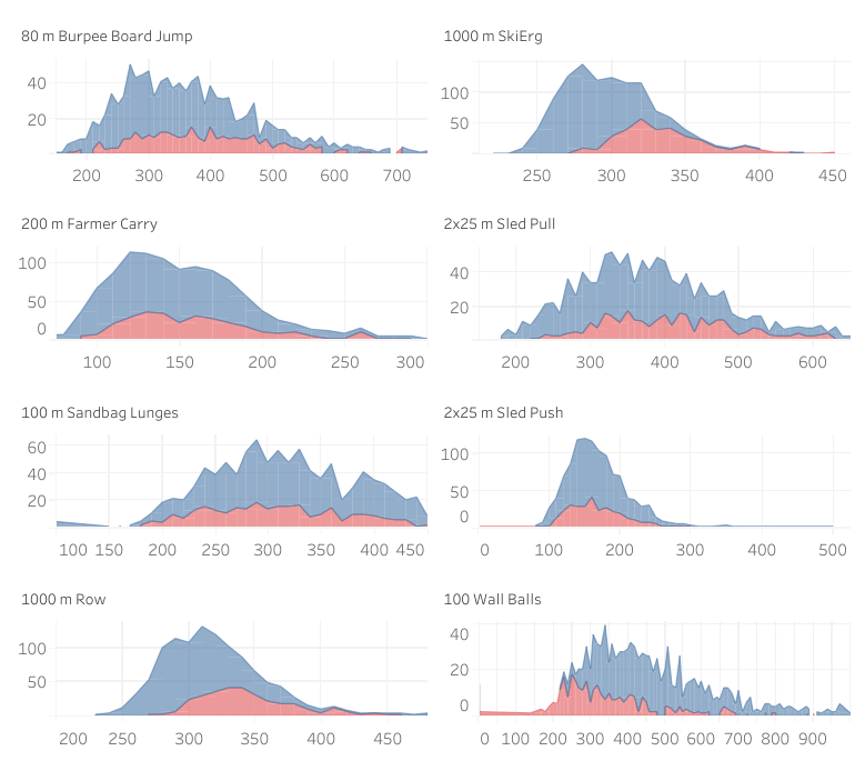 จากการวิเคราะห์ข้อมูลและดูการกระจายตัวของเวลาในแต่ละด่าน เราพบว่า Wall Balls, Sled Pull เป็น Station ที่สามารถสร้างความแตกต่างได้มากที่สุดในเวลารวมของการแข่งขัน(ถ้าเราทำเวลาของทุกๆ Station ได้เข้าใกล้ค่าเฉลี่ยแล้ว)
