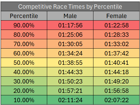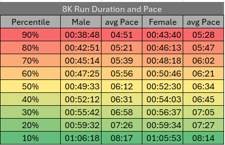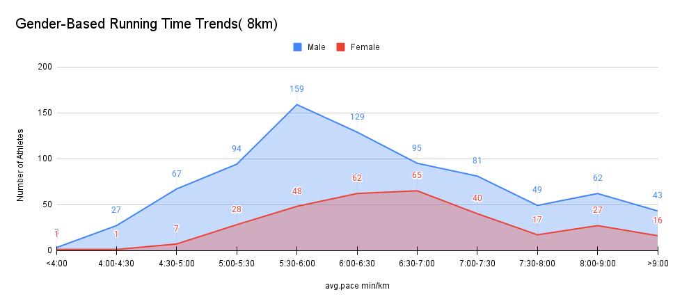 จะเห็นว่า นักกีฬาชายกลุ่ม Top Performers (10%) มีความเร็วเฉลี่ยที่ 4:51 นาที/กิโลเมตร และนักกีฬาหญิงที่ 5:28 นาที/กิโลเมตร ขณะที่นักกีฬาค่าเฉลี่ย (Median – 50%) วิ่งที่ 6:12 นาที/กิโลเมตร สำหรับชาย และ 6:34 นาที/กิโลเมตร สำหรับหญิง