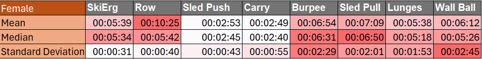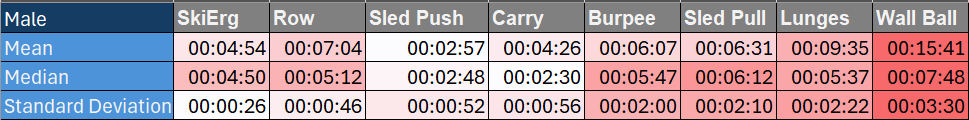 หากพิจารณา Mean (ค่าเฉลี่ย) และ Median (ค่ากลาง) ของแต่ละ Station จะเห็นว่า Wall Balls เป็นด่านที่ใช้เวลามากที่สุดในกลุ่ม ผู้ชาย ส่วน Rowing เป็นด่านที่ใช้เวลามากที่สุดในกลุ่ม ผู้หญิง สิ่งนี้ชี้ให้เห็นว่า ยิ่งค่าเฉลี่ยสูง ด่านนั้นยิ่งยากและใช้เวลานาน ดังนั้นนักกีฬาควร ฝึกให้สามารถทำเวลาได้ใกล้ Mean หรือดีกว่า เพื่อให้ได้เปรียบในการแข่งขัน