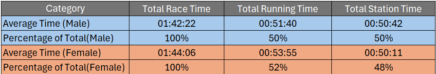การแข่งขัน HYROX ไม่ใช่แค่การวิ่ง แต่เป็น การบาลานซ์ระหว่างการวิ่งกับการทำ Workout Stations จากข้อมูลค่าเฉลี่ยของนักกีฬาชายและหญิง พบว่า เวลาการแข่งขันถูกแบ่งออกเป็นสองส่วนที่เกือบเท่ากัน