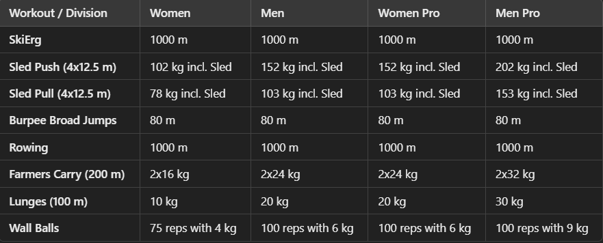 โครงสร้างการแข่งขัน ประกอบไปด้วย วิ่ง 1 กิโลเมตร ตามด้วย 1 workout station ซึ่งทำทั้งหมด 8 รอบ ดังนี้